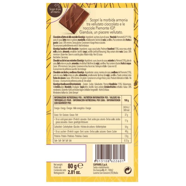 La Tavoletta Gianduia Classica di Caffarel è prodotta con ingredienti selezionati, tra cui cacao finissimo e nocciole pregiate, lavorati secondo antiche ricette per offrire una consistenza cremosa e un gusto inconfondibile. Caffarel utilizza solo nocciole piemontesi IGP, garantendo un sapore ricco e naturale.